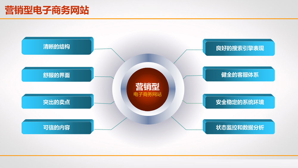 3、以營銷為導向、以營銷為主、技術為輔 傳統網站不營銷,除了技術落后之外,更重要的是思想、理念落后。網站要想起到網絡營銷的作用,關鍵因素是是否站在營銷的高度設計。始終奉行“營銷為主、技術為輔”的理念,只建設真正營銷型的企業網站。